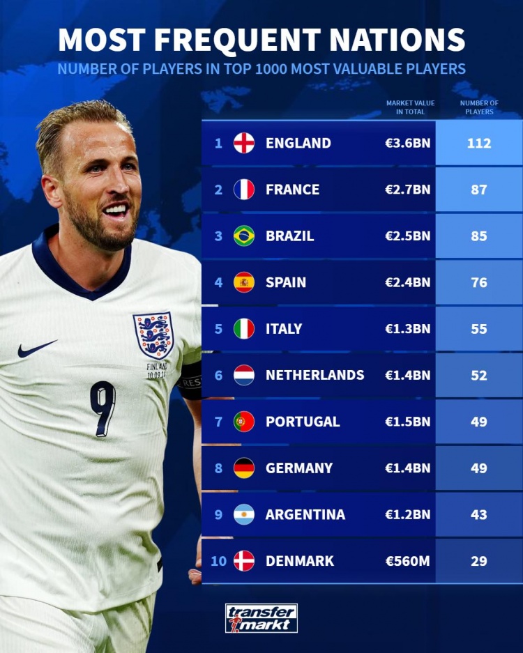 2月16日訊 德國轉(zhuǎn)會(huì)市場統(tǒng)計(jì)了身價(jià)前1000名各國球員的人數(shù),并列出榜單,英格蘭112人居首,法國、巴西二三位。