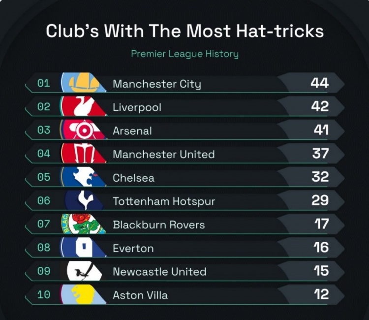 Squawka統(tǒng)計(jì)了英超歷史各隊(duì)球員戴帽的次數(shù),并列出榜單,曼城44次居首,利物浦42次第二。