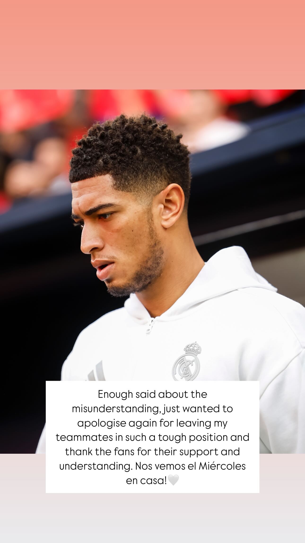 貝林厄姆:“關于這場誤會,已經(jīng)說得夠多了,現(xiàn)在我只想再次為讓隊友們陷入如此艱難的境地而道歉, 也感謝球迷們的支持與理解。周三主場見(歐冠對陣曼城)!”