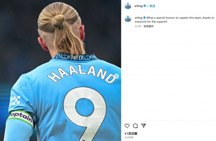 哈蘭德也通過(guò)社媒曬出自己佩戴曼城隊(duì)長(zhǎng)袖標(biāo)的照片,并配文:“非常榮幸第一次成為這支球隊(duì)的隊(duì)長(zhǎng),感謝所有人的支持。”