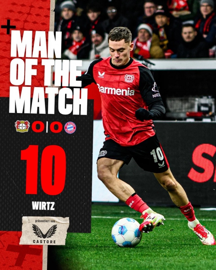 2月17日訊 德甲第22輪焦點(diǎn)戰(zhàn),勒沃庫森主場(chǎng)0-0和拜仁握手言和。賽后,勒沃庫森官方宣布,維爾茨當(dāng)選本場(chǎng)比賽的隊(duì)內(nèi)最佳球員。